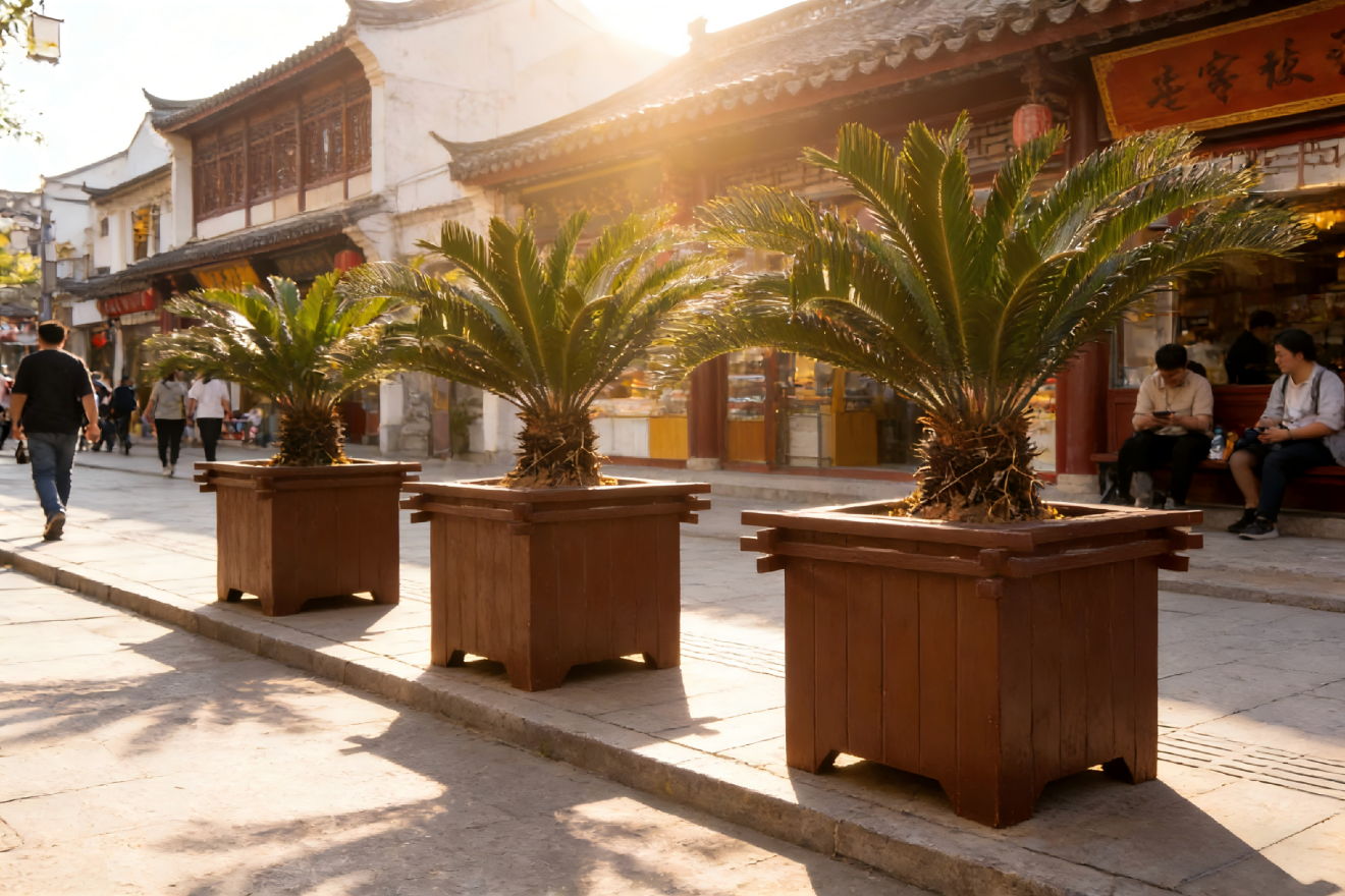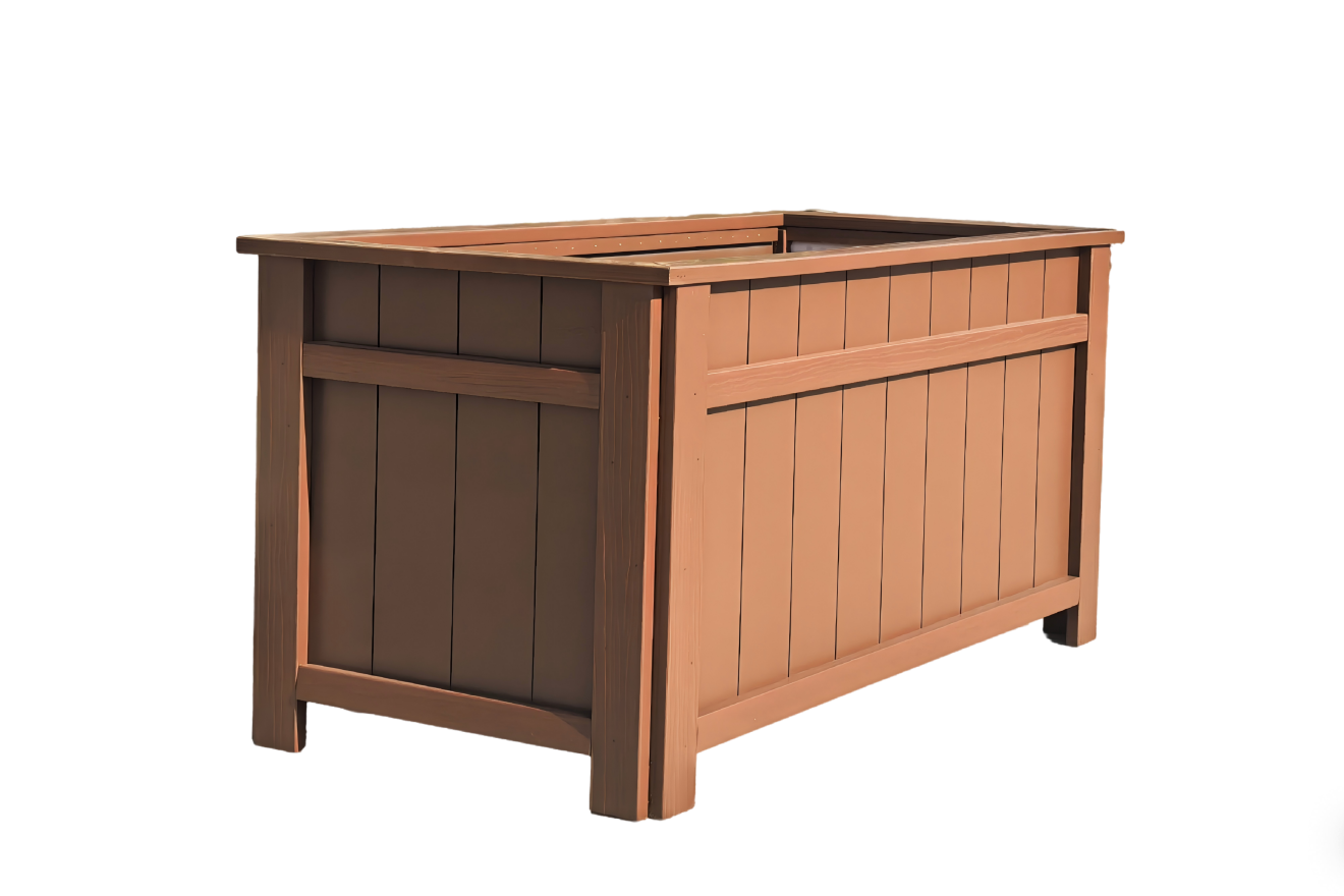 PVC相比较于防腐木,PVC材质更加耐用持久,不易褪色,且防火防潮。相对于金属材质,钣金、铝合金花箱,PVC材质,有一定的隔热效果,夏天对于植物有更好的防护作用。