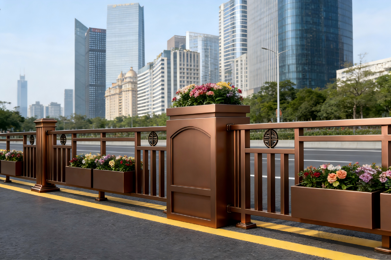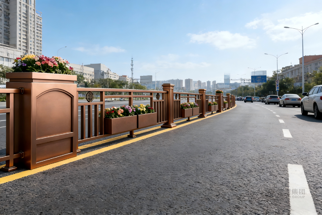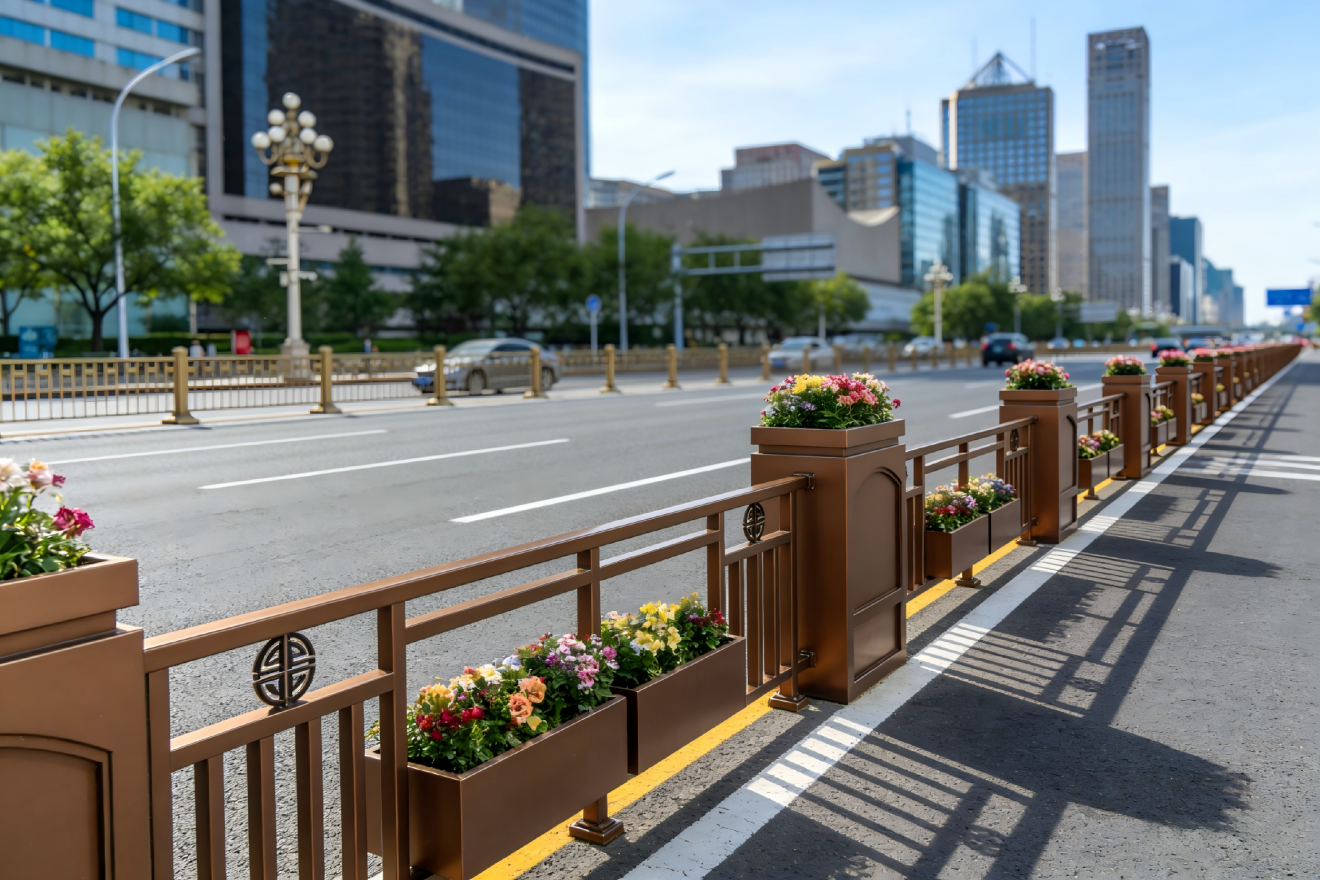 道路景观绿化一直是城市景观提升的重要内容。通常做法,在道路设计的时候,留出绿化带,种植花草,形成靓丽的风景线。然城市中很多原有的道路比较狭窄,没有绿化带。如何利用原有的道路空间,对城市道路进行景观绿化?艺术景观花箱护栏的出现便很好解决这一问题,就把景观花箱和交通护栏整合融为一体,既做到的交通隔离安全防护的作用,也提升了城市道路景观。
