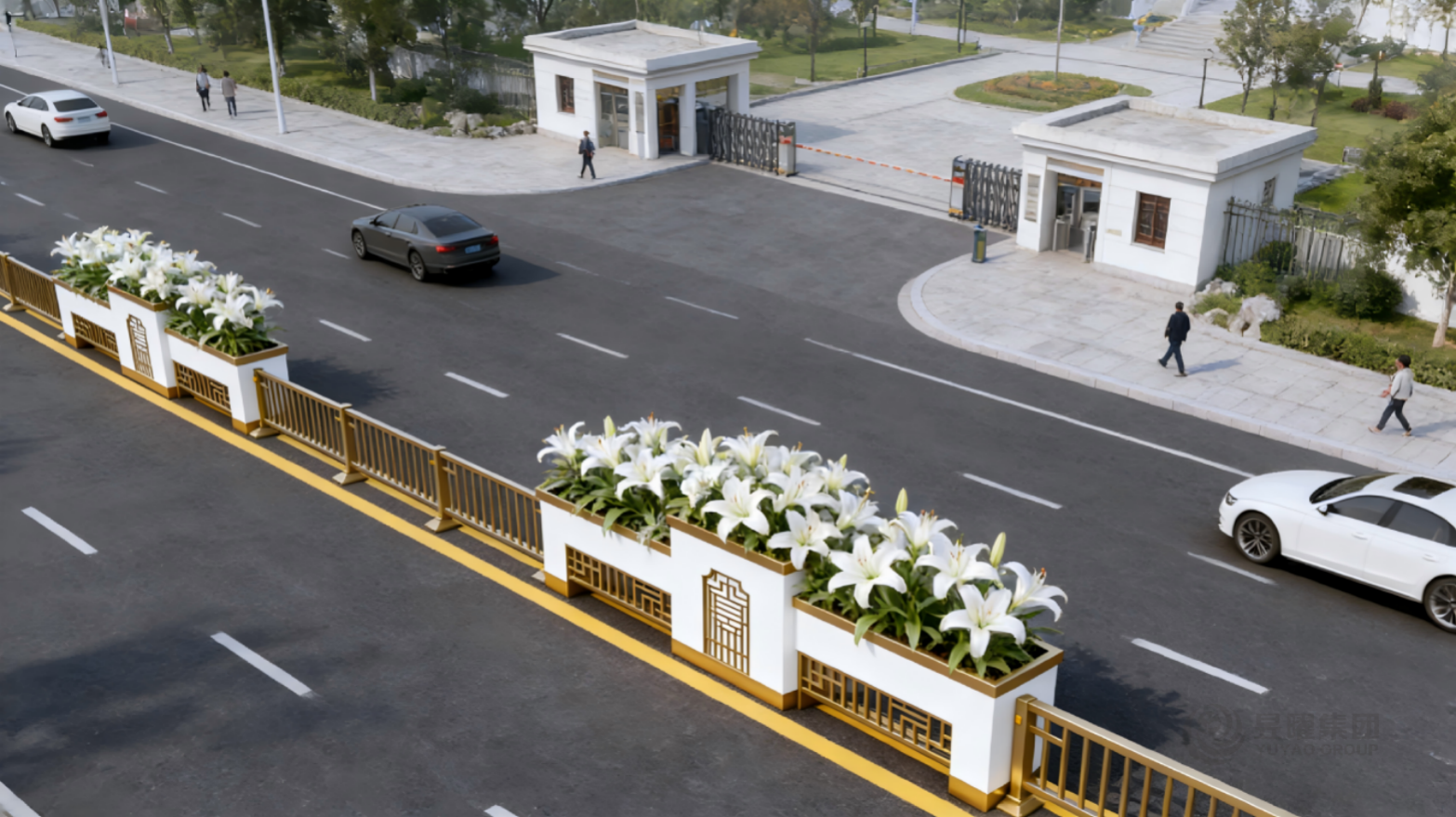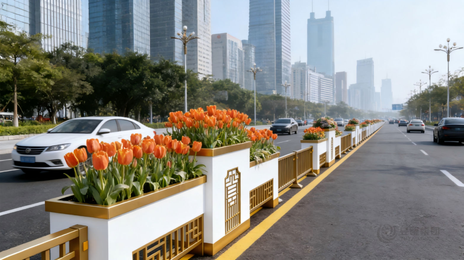 道路景观绿化一直是城市景观提升的重要内容。通常做法,在道路设计的时候,留出绿化带,种植花草,形成靓丽的风景线。然城市中很多原有的道路比较狭窄,没有绿化带。如何利用原有的道路空间,对城市道路进行景观绿化?艺术景观花箱护栏的出现便很好解决这一问题,就把景观花箱和交通护栏整合融为一体,既做到的交通隔离安全防护的作用,也提升了城市道路景观。