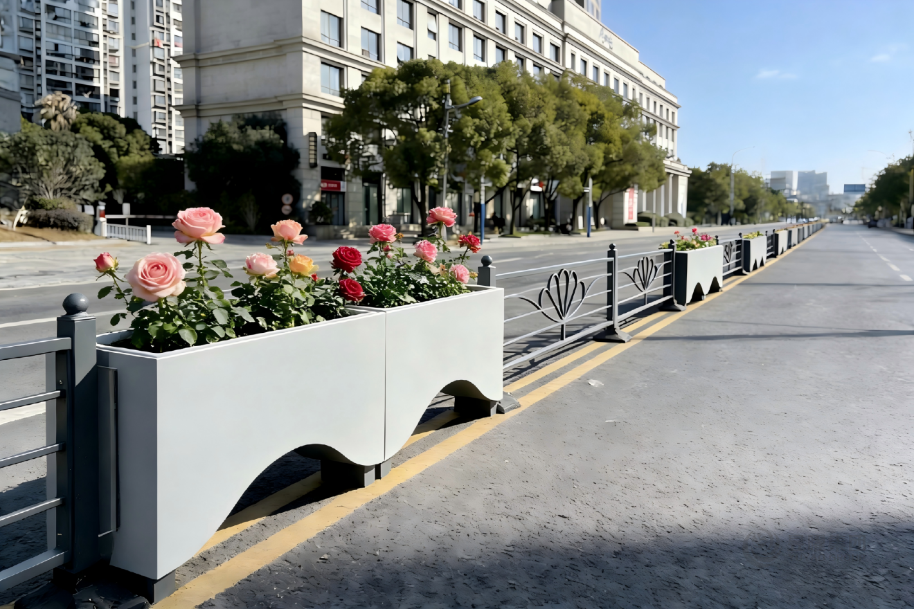 道路景观绿化一直是城市景观提升的重要内容。通常做法,在道路设计的时候,留出绿化带,种植花草,形成靓丽的风景线。然城市中很多原有的道路比较狭窄,没有绿化带。如何利用原有的道路空间,对城市道路进行景观绿化?艺术景观花箱护栏的出现便很好解决这一问题,就把景观花箱和交通护栏整合融为一体,既做到的交通隔离安全防护的作用,也提升了城市道路景观。