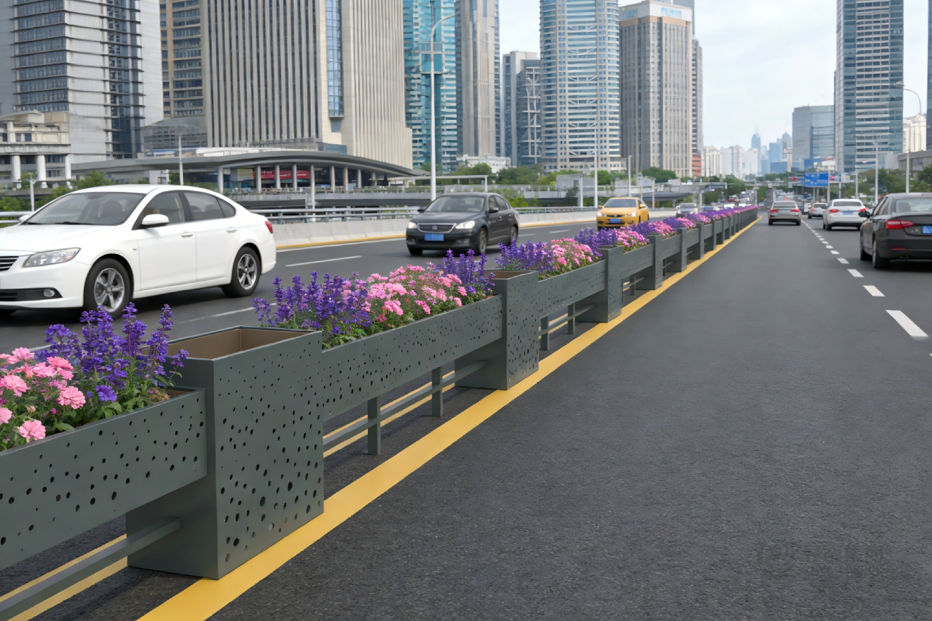 道路景观绿化一直是城市景观提升的重要内容。通常做法,在道路设计的时候,留出绿化带,种植花草,形成靓丽的风景线。然城市中很多原有的道路比较狭窄,没有绿化带。如何利用原有的道路空间,对城市道路进行景观绿化?艺术景观花箱护栏的出现便很好解决这一问题,就把景观花箱和交通护栏整合融为一体,既做到的交通隔离安全防护的作用,也提升了城市道路景观。