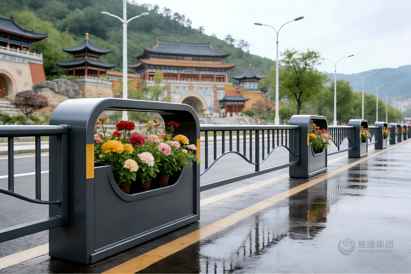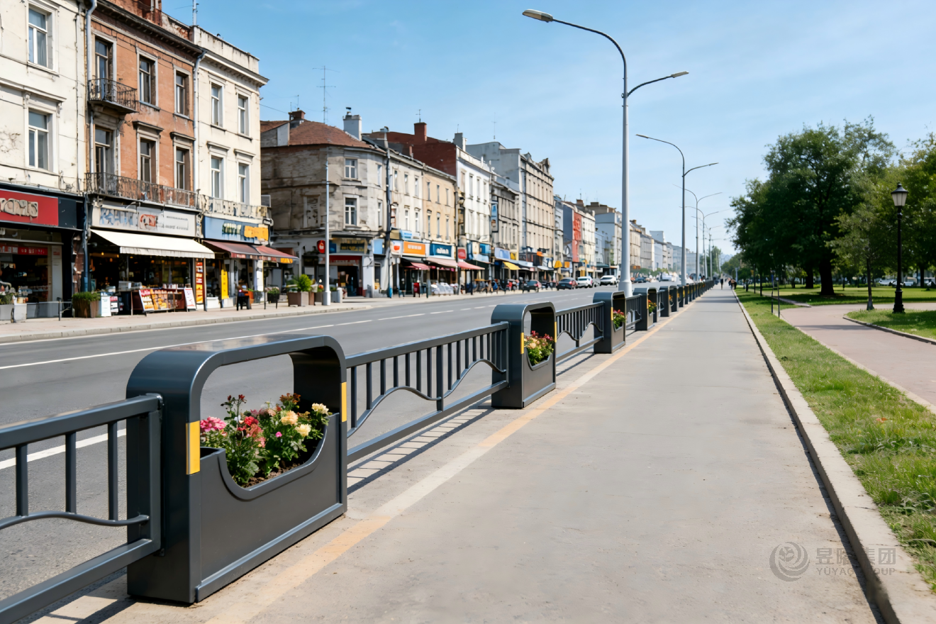 道路景观绿化一直是城市景观提升的重要内容。通常做法,在道路设计的时候,留出绿化带,种植花草,形成靓丽的风景线。然城市中很多原有的道路比较狭窄,没有绿化带。如何利用原有的道路空间,对城市道路进行景观绿化?艺术景观花箱护栏的出现便很好解决这一问题,就把景观花箱和交通护栏整合融为一体,既做到的交通隔离安全防护的作用,也提升了城市道路景观。