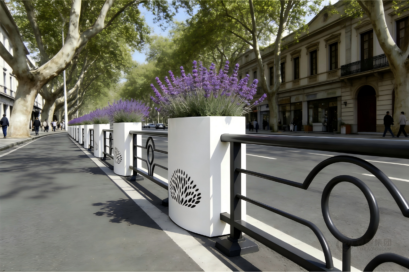 道路景观绿化一直是城市景观提升的重要内容。通常做法,在道路设计的时候,留出绿化带,种植花草,形成靓丽的风景线。然城市中很多原有的道路比较狭窄,没有绿化带。如何利用原有的道路空间,对城市道路进行景观绿化?艺术景观花箱护栏的出现便很好解决这一问题,就把景观花箱和交通护栏整合融为一体,既做到的交通隔离安全防护的作用,也提升了城市道路景观。