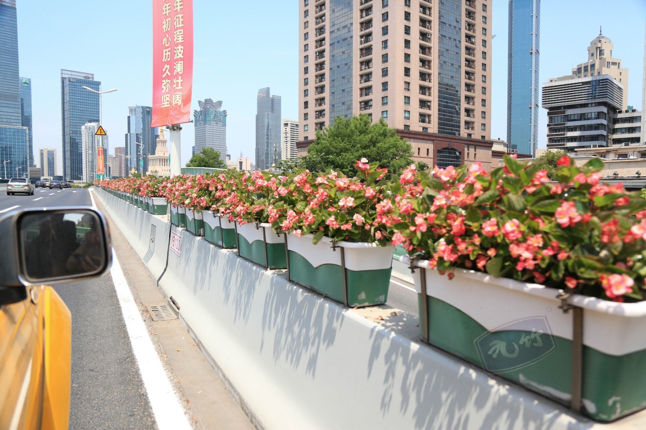 5.安装和维护:高架桥花箱的安装和维护也具有独特之处。在浇筑高架两侧护栏时,预留了放置花箱的槽体和供水管道通道。花箱采用玻璃钢材质,耐用且无二次污染,节水节能。植物通过自动供水系统吸收水分,养护工人只需定期拔草、施肥。