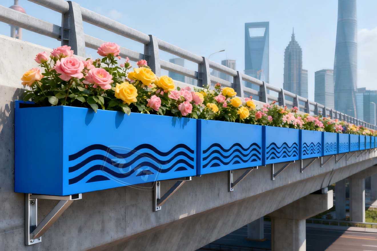 2.外悬挂式花箱:安装在桥梁外侧,适合种植藤蔓类植物,可以节省高架的内部空间占用。