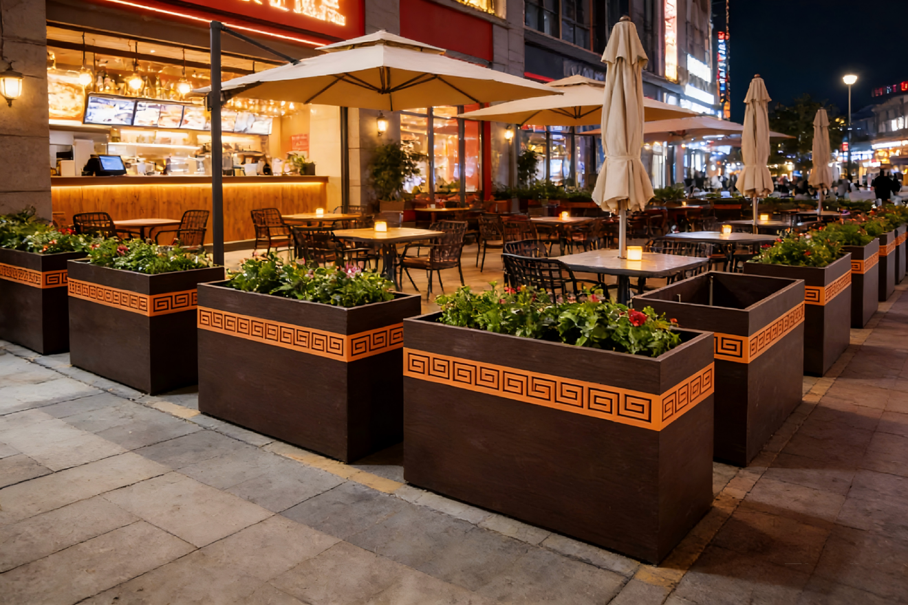 一、设计原则与功能定位空间划分与动线引导采用模块化铁艺花箱组合,通过L型、U型或长条形布局灵活划分行人通道、休憩区与商业外摆空间,底部万向轮设计便于快速调整···...