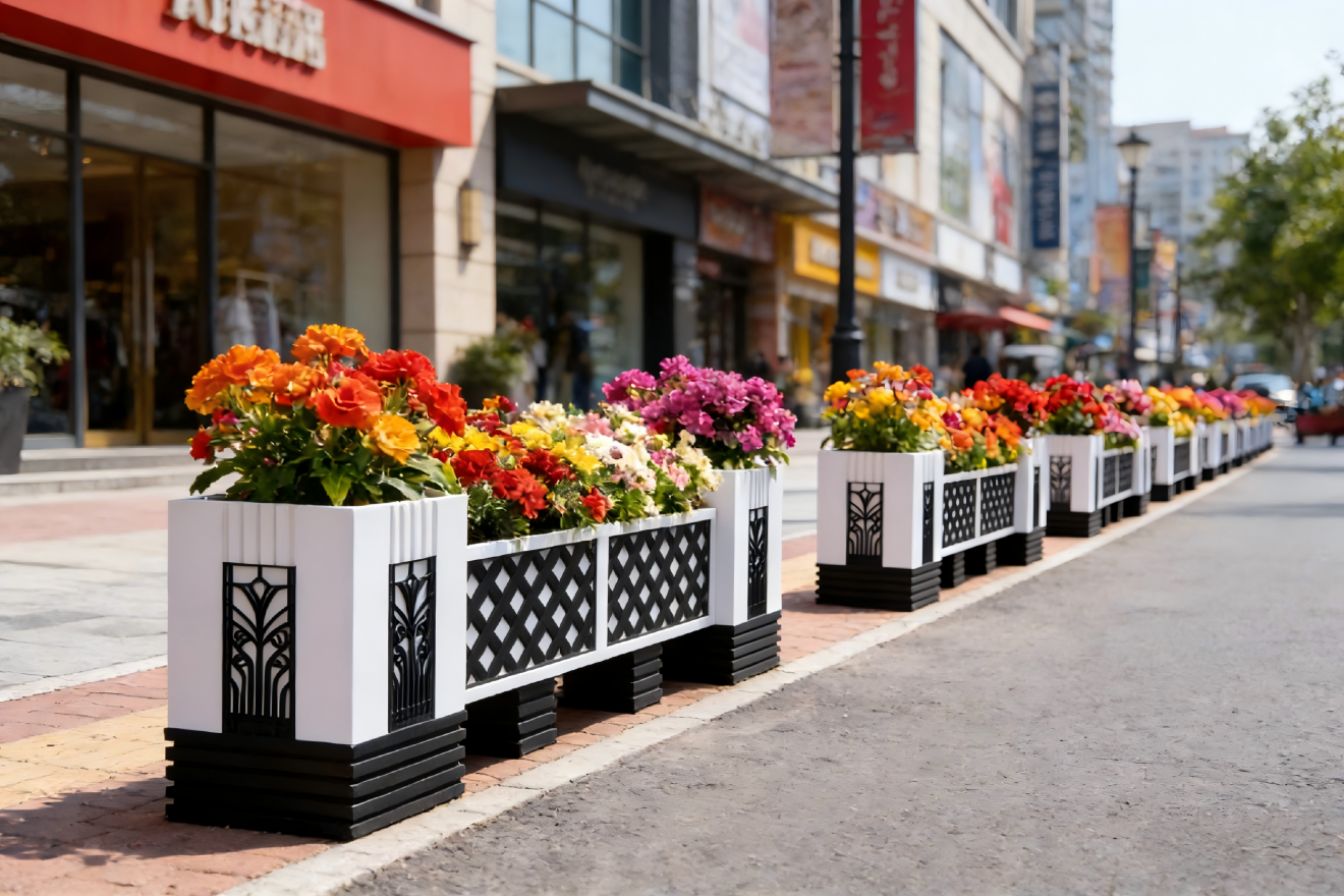 一、设计原则与功能定位空间划分与动线引导采用模块化铁艺花箱组合,通过L型、U型或长条形布局灵活划分行人通道、休憩区与商业外摆空间,底部万向轮设计便于快速调整···...