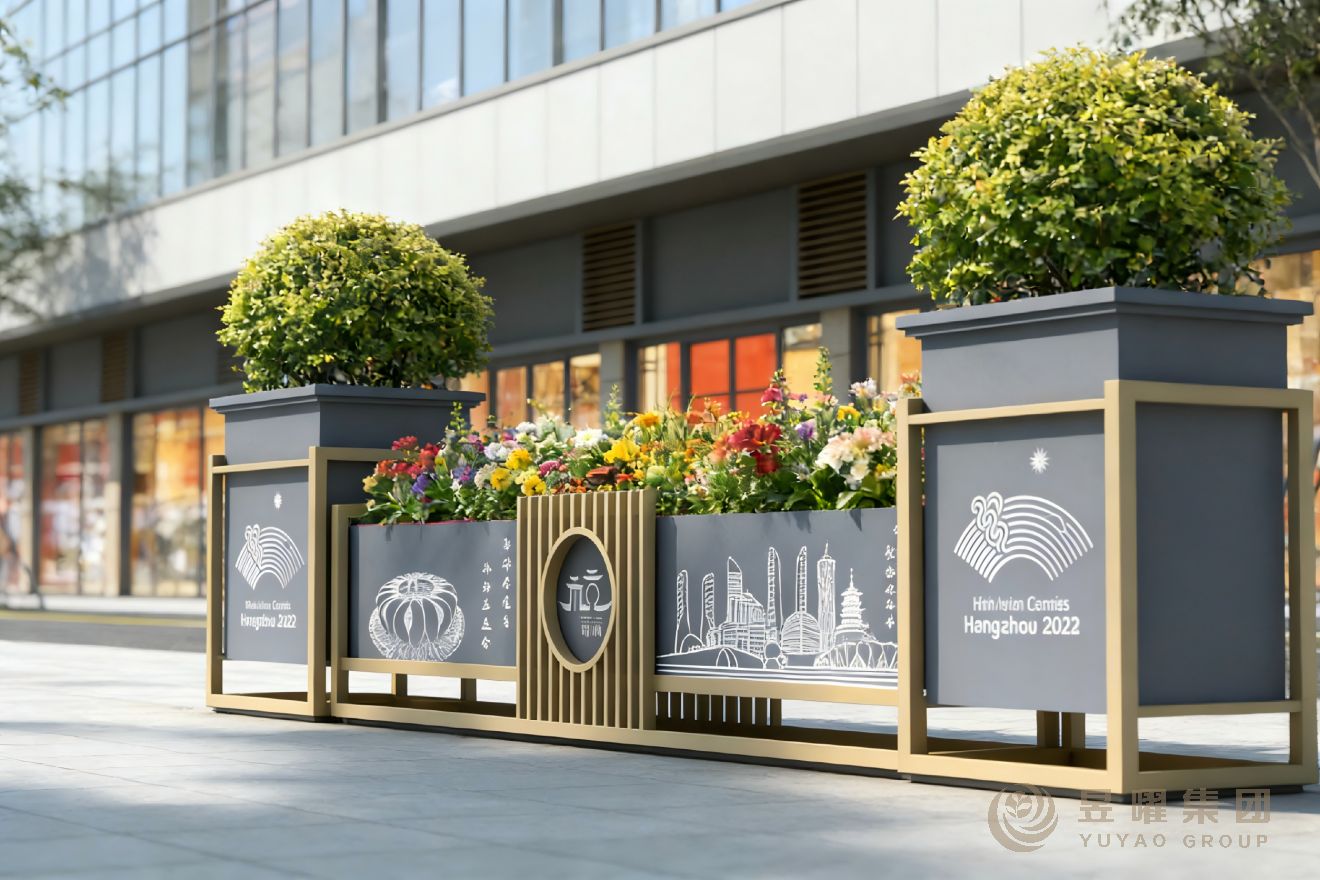 一、设计原则与功能定位空间划分与动线引导采用模块化铁艺花箱组合,通过L型、U型或长条形布局灵活划分行人通道、休憩区与商业外摆空间,底部万向轮设计便于快速调整···...