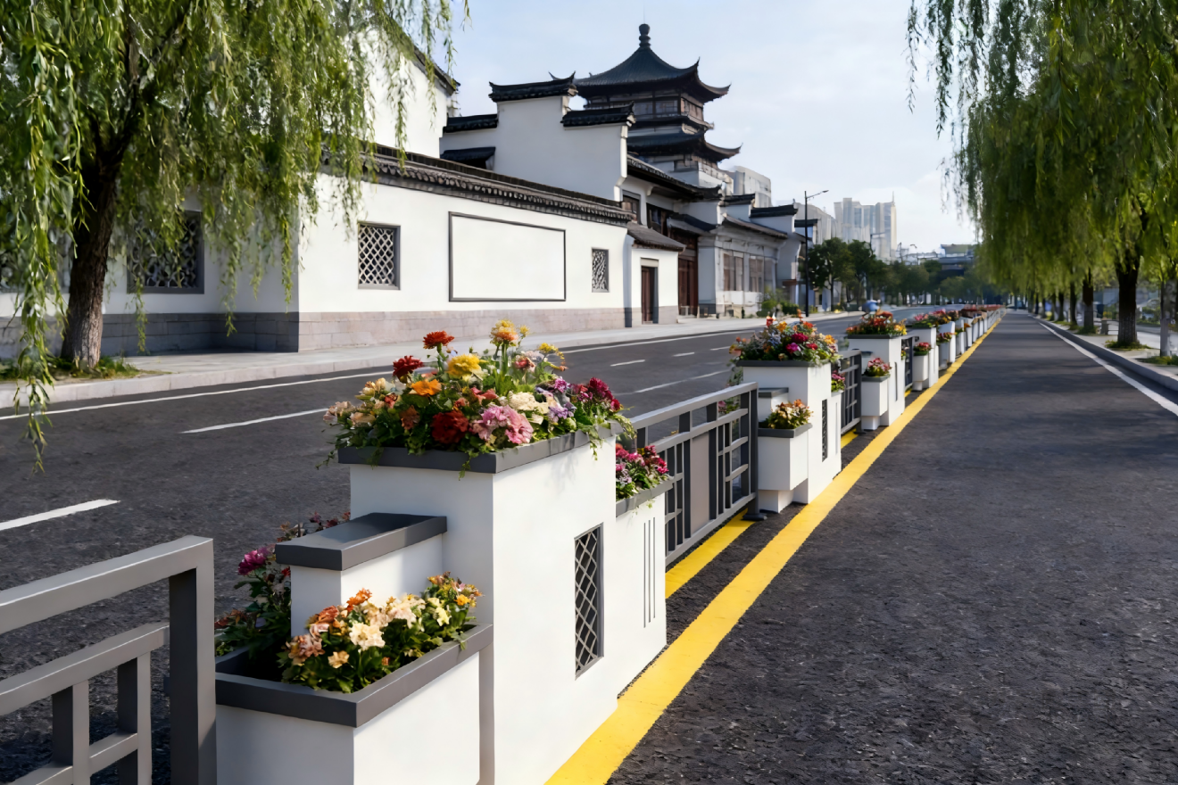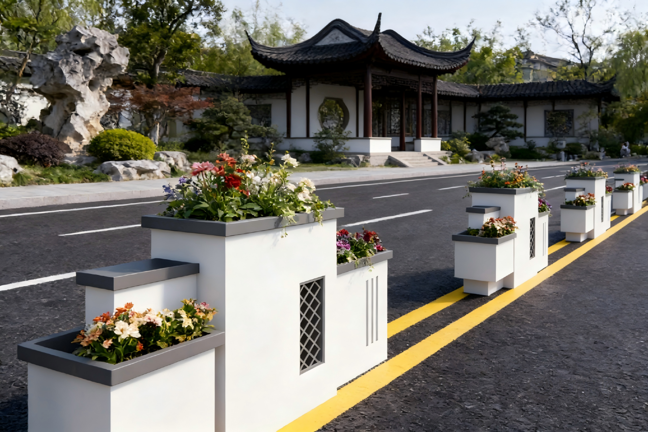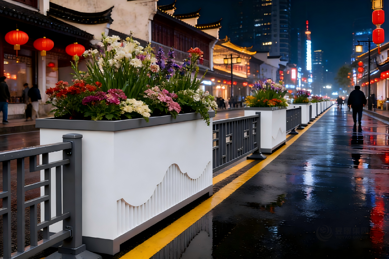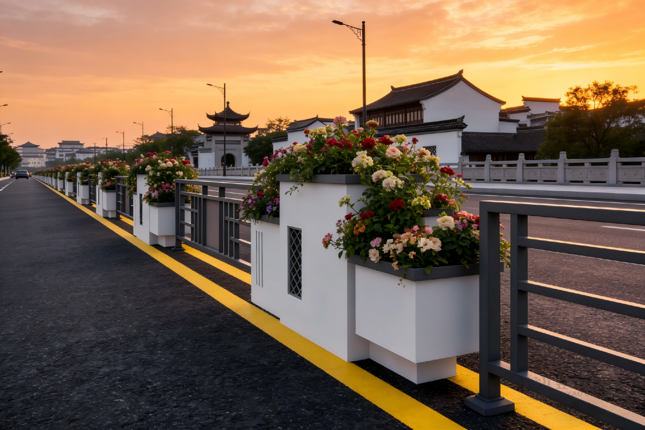 道路景观绿化一直是城市景观提升的重要内容。通常做法,在道路设计的时候,留出绿化带,种植花草,形成靓丽的风景线。然城市中很多原有的道路比较狭窄,没有绿化带。如何利用原有的道路空间,对城市道路进行景观绿化?艺术景观花箱护栏的出现便很好解决这一问题,就把景观花箱和交通护栏整合融为一体,既做到的交通隔离安全防护的作用,也提升了城市道路景观。